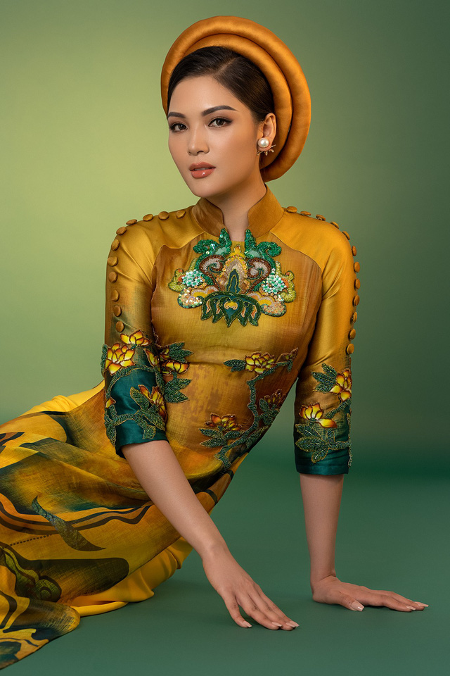 Người đẹp cho biết dù thi trực tuyến, cô vẫn đầu tư kỹ lưỡng trang phục, hình ảnh. Cô chọn các thiết kế áo dài cách điệu trong bộ sưu tập Kim Sắc Niên Hoa của NTK Vũ Lan Anh, làm từ chất liệu tơ tằm, gấm cao cấp.