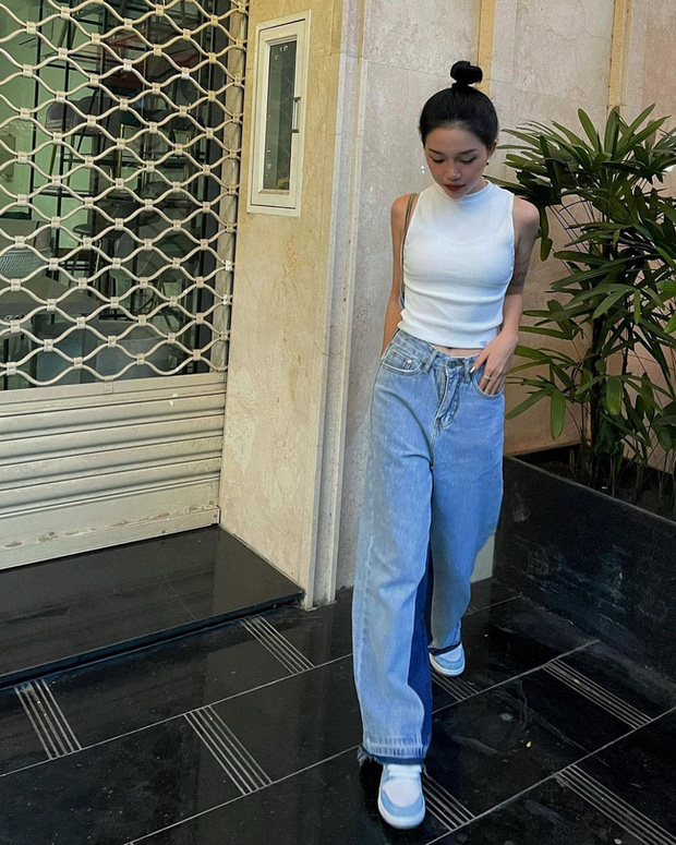 Những chiếc áo tank top không chỉ hợp với quần tây mà còn cực kỳ ăn ý khi kết hợp với quần jeans ống suông. Sự kết hợp giữa màu trắng và xanh denim giúp Linh Ngọc Đàm có được vẻ ngoài sáng sủa, trẻ trung và cá tính. Mẫu giày hợp lý để mix với combo này chính là sneaker trắng