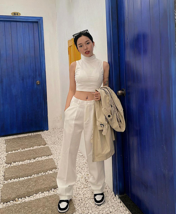 Linh Ngọc Đàm chứng minh là chẳng cần cầu kỳ, chị em cứ mix áo crop top trắng với quần âu xuyệt tông là không bao giờ "fail". Combo này ghi mạnh điểm chất chơi, thời thượng và sang xịn miễn chê