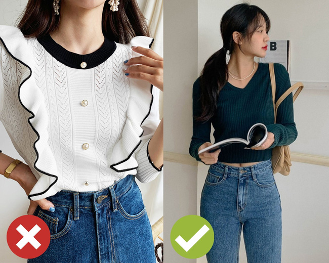 Tất nhiên, vẫn có những chiếc áo len độn vai hay tay bồng được các quý cô sành điệu yêu thích. Thế nhưng, cái gì quá cũng không tốt và bạn đừng nên chọn những chiếc áo len độn vai quá cao, kết hợp với phần tay bồng to bởi item này sẽ khiến phần thần trên của bạn trở nên thô kệch, vóc dáng kém thanh thoát. Vẻ ngoài còn có thể hóa sến và quê kiểng nữa.