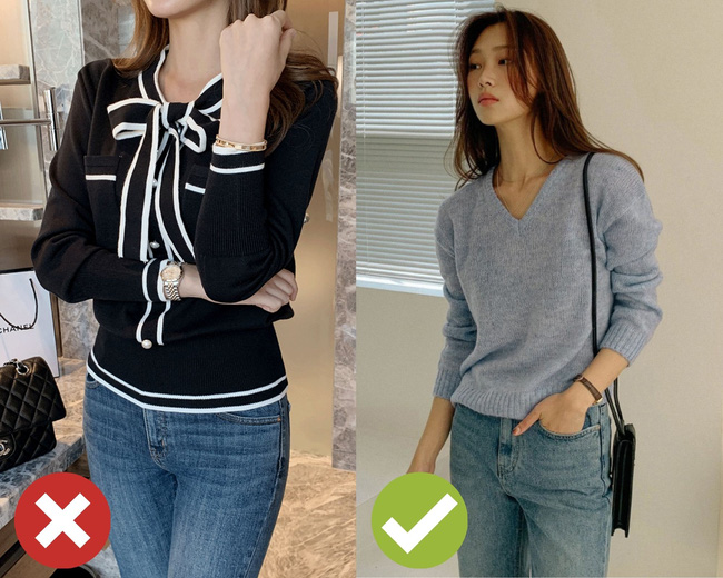 Áo blouse cổ buộc nơ thì rất ổn, đây là item hot nhất nhì mùa Hè vì sự sang trọng và bay bổng. Tuy nhiên áo len buộc nơ thì lại mang một cảm giác khác hẳn, có lẽ là do chất liệu vải dày dặn, không có độ "bay" đã khiến cho những chiếc áo len cổ nơ buộc trở nên kém "chanh sả", thệm chí là mang lại cảm giác thắm thơm, quê kiểng. Áo len vẫn đẹp nhất là khi mang thiết kế cổ tròn, cổ chữ V hoặc cổ bẻ. Những kiểu dáng cơ bản này không chỉ dễ mặc mà còn rất dễ mix đồ. Bạn cứ kết hợp với quần jeans, quần ống rộng, chân váy dáng xòe, dáng suông rồi mix ngoài chiếc áo blazer hay trench coat, vậy là đẹp và sành điệu khỏi nghĩ ngợi.