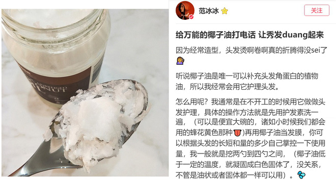 Để giữ mái tóc dài thướt tha bồng bềnh của mình, Phạm Băng Băng đặc biệt tin tưởng một loại dầu dưỡng tóc suốt nhiều năm qua, đó chính là dầu dừa.Và chính cô cũng chia sẻ trên trang cá nhân của mình về sự hiệu nghiệm của loại dầu dưỡng bình dân mà vô cùng hiệu nghiệm này.