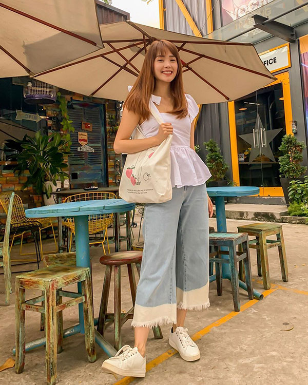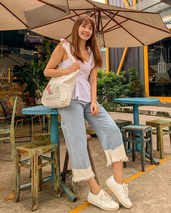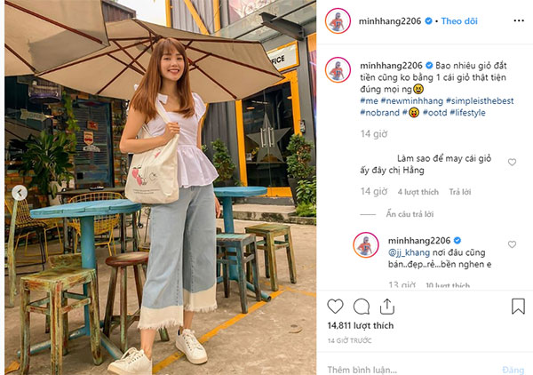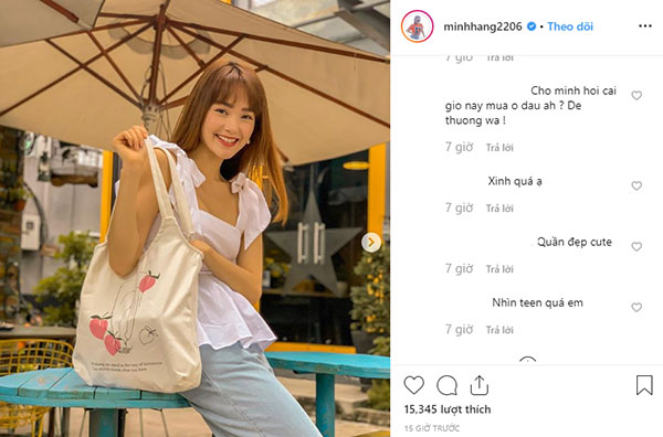 Tổng thể trang phục đẹp mắt, trendy là vậy nhưng theo như chia sẻ của Minh Hằng, ngôi sao thực sự của set đồ lại là chiếc túi vải cỡ lớn – item có thể đựng được cả thế giới của phái đẹp ở bên trong, lại khá xuyệt tông với bộ cánh Minh Hằng đang diện.