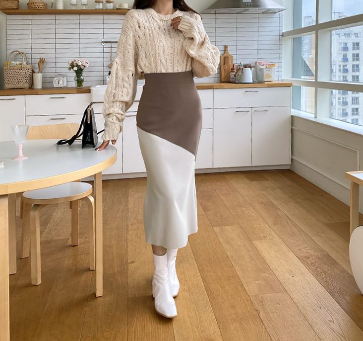 Dìm dáng nhất chính là cách mix áo buông thả với chân váy, vì chiều cao khiêm tốn nên bạn nhất định phải sơ vin áo vào chân váy. Nếu là những kiểu áo len hơi dày một chút thì chỉ cần sơ vin phía trước thôi là được.