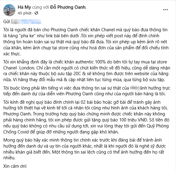 Theo đó, cô khẳng định rằng chiếc khăn trên được mua trực tiếp tại cửa hàng Chanel London ở Selfridges - 1 trong 2 khu mua sắm đồ xa xỉ lớn nhất nước Anh. Sản phẩm sở dĩ không tìm được trên website là bởi hãng đã thay đổi mẫu mã. Hà My còn tự tin hứa rằng sẽ gửi tặng 100 triệu VNĐ nếu người tung tin đồn trên chứng minh được chiếc khăn Chanel của Phương Oanh là hàng fake. Đính kèm trong bài đăng là rất nhiều ảnh chụp thể hiện chiếc khăn của này là hàng chính hãng.