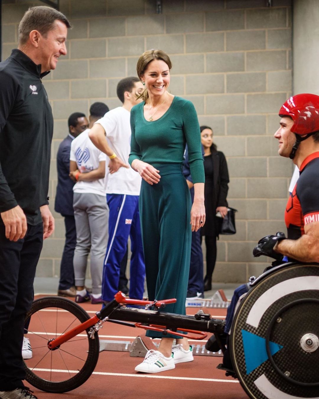 Và để có được vẻ ngoài trẻ trung phơi phới đến vậy, Công nương Kate đã áp dụng một bí kíp tuyệt hay đó là chọn quần âu với độ dài trên mắt cá chân một chút, mix với giày sneakers trắng và không quên sơ vin.