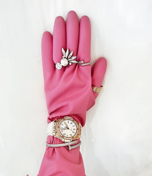 Jolie Nguyễn là một trong những fashionista được giới trẻ yêu thích. Cô nàng luôn gắn liền với phong cách thời trang vô cùng đẳng cấp, sành điệu, phủ ngập hàng hiệu đắt đỏ trên mỗi set đồ. Thế nhưng mới đây cô nàng đã khiến dân tình ngỡ ngàng khi lên đồ với món phụ kiện là đôi găng tay rửa chén có giá chỉ 50 ngàn đồng. Jolie Nguyễn đã 'thăng cấp' cho món phụ kiện rẻ tiền này bằng loạt trang sức vô cùng đắt đỏ. Sự sáng tạo của Jolie Nguyễn đã nhận được nhiều lời khen ngợi của cư dân mạng.