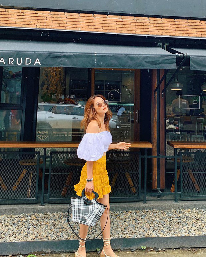 Áo trễ vai + chân váy ngắn xinh miễn bàn