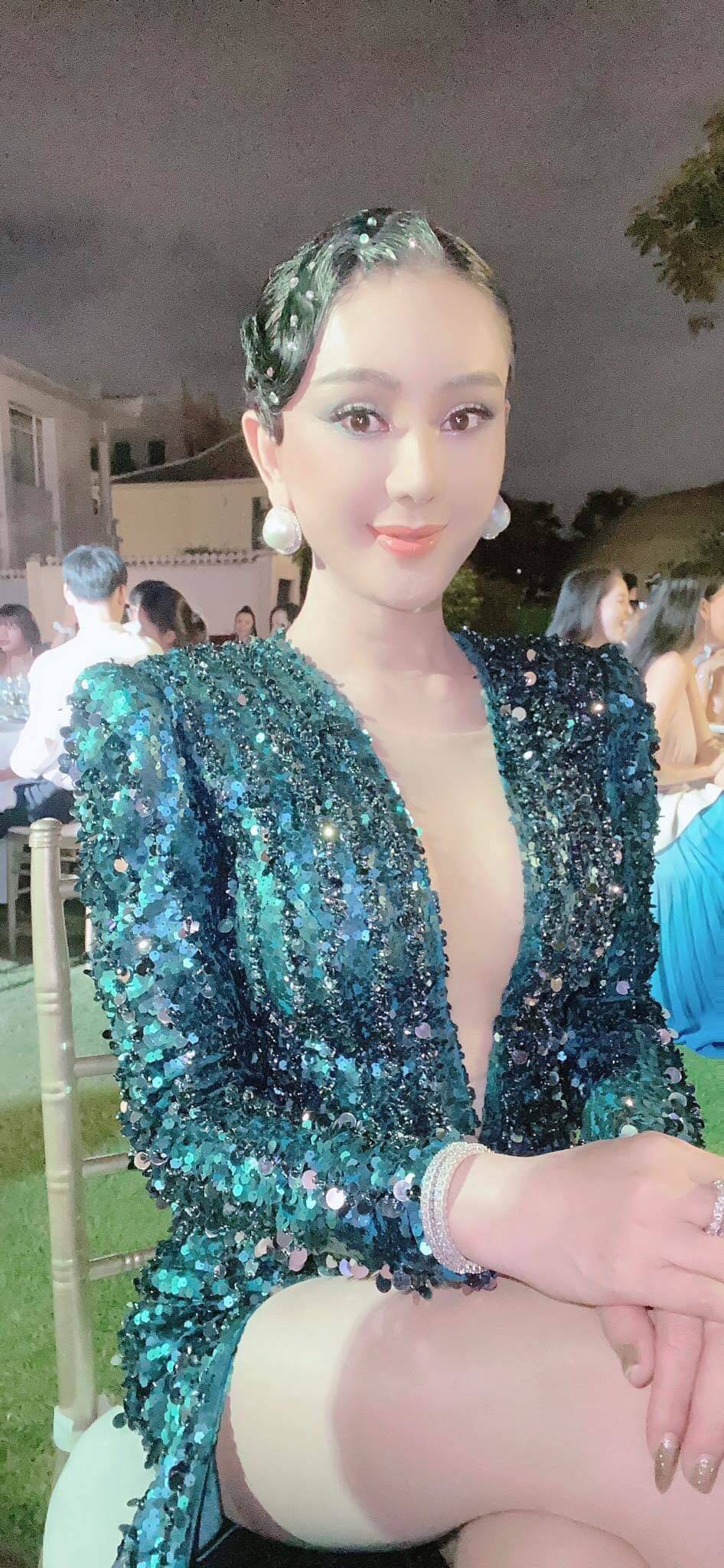 Mọi người "đứng hình" cũng phải thôi, khi mà Lâm Khánh Chi quá đỗi nổi bật lộng lẫy khi xuất hiện tại lễ cưới tình cũ. Cô diện bộ đầm xanh ánh kim lấp lánh với thiết kế khoét ngực, xẻ cao hiểm hóc, chưa kể mái tóc được tạo kiểu cầu kỳ càng tăng vẻ ngoài kiêu sa, lộng lẫy của Lâm Khánh Chi.