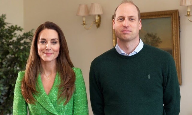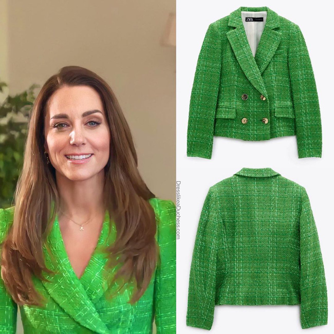 Xuất hiện trong video chúc mừng Ngày Thánh Patricio (Saint Patrick's Day), Công nương Kate tỏa sáng rực rỡ bên ông xã William khi diện lên mình chiếc áo blazer vải tweed, mang tông màu xanh lá cây đúng chuẩn gam màu biểu tượng của ngày lễ. Công bằng mà nói thì gam màu của chiếc áo có hơi chói chang, khó nhằn nhưng vào tay Công nương Kate, mẫu áo này bỗng trở nên vô cùng sang trọng, thời thượng và đổi lại, mẫu blazer cũng giúp bà mẹ hai con hoàn thiện vẻ ngoài trẻ trung.