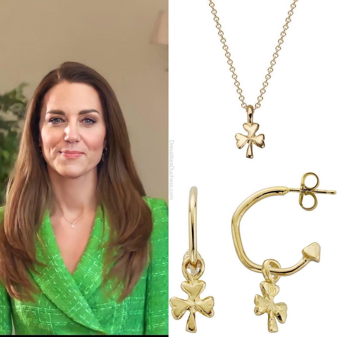Cách nhấn nhá phụ kiện của Công nương Kate cũng vô cùng tinh tế khi cô chọn bộ trang sức nhỏ gọn, thanh tú để đảm bảo độ hài hòa, thanh nhã cho tổng thể trang phục. Chưa hết, thiết kế mang hình dáng cỏ ba lá của bộ trang sức cũng chính là biểu tượng của Ngày Thánh Patricio và rõ ràng, Công nương Kate đã cho thấy cô là một người chỉn chu, tinh tế ngay cả trong những chi tiết nhỏ nhất.