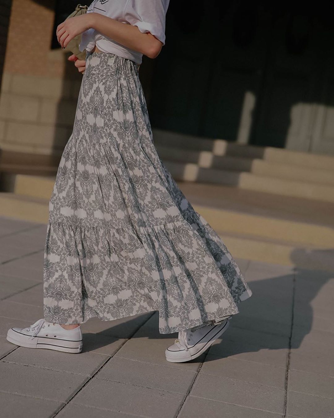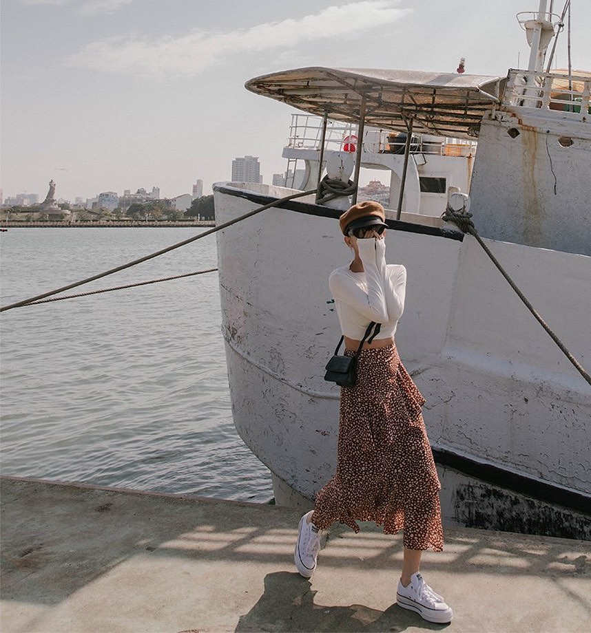 Nét năng động của giày sneakers hóa ra lại rất hợp với vẻ nữ tính của chân váy. Kiểu giày này giúp tổng thể trang phục thêm trẻ trung, sành điệu nhưng không làm mất đi nét duyên dáng vốn có của váy vóc bánh bèo. Bật mí là mùa Xuân này, combo chân váy dáng suông + giày sneakers đang rất được ưu ái, diện lên sang – xịn – mịn cực kỳ.