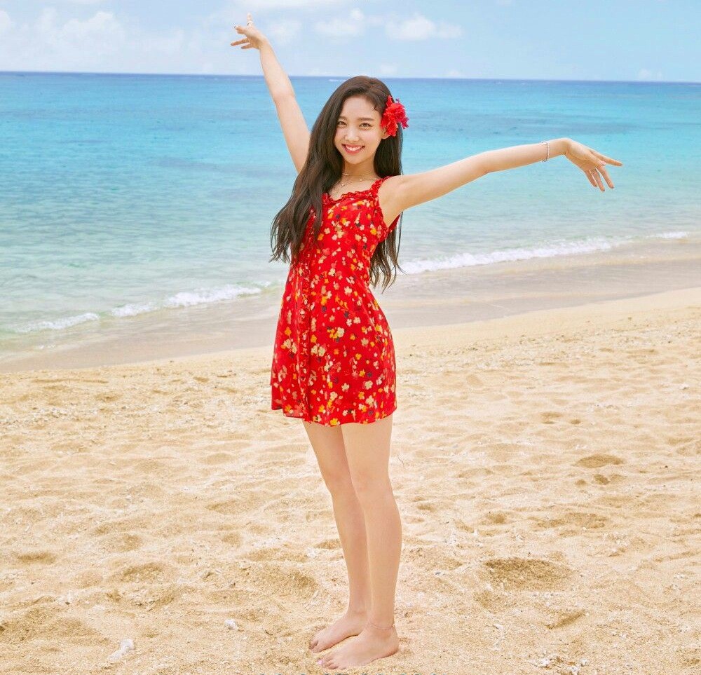 Trong MV Dance The Night Away, cô nàng Nayeon từng diện mẫu váy đỏ họa tiết xinh xẻo. Kiểu tóc buông xõa tô điểm với bông hoa rực rỡ đúng không khí vui tươi náo nhiệt của những ngày hè.