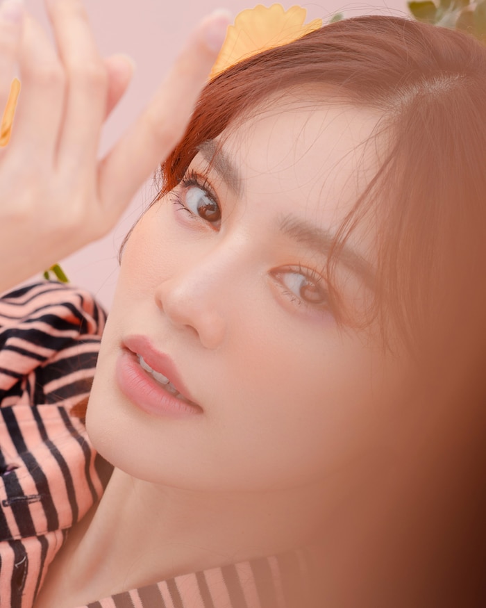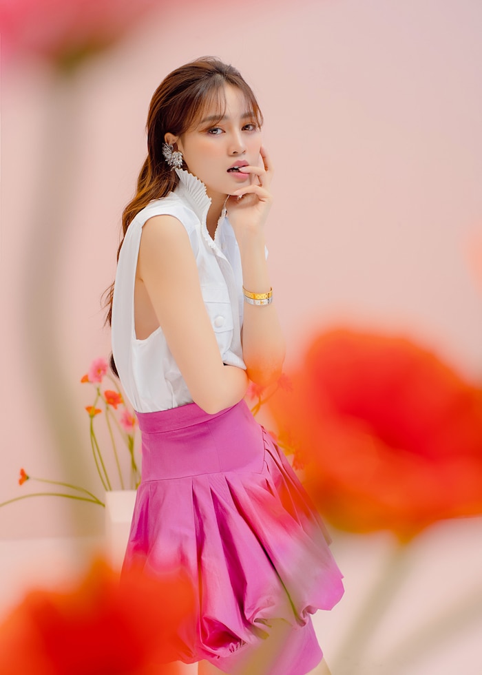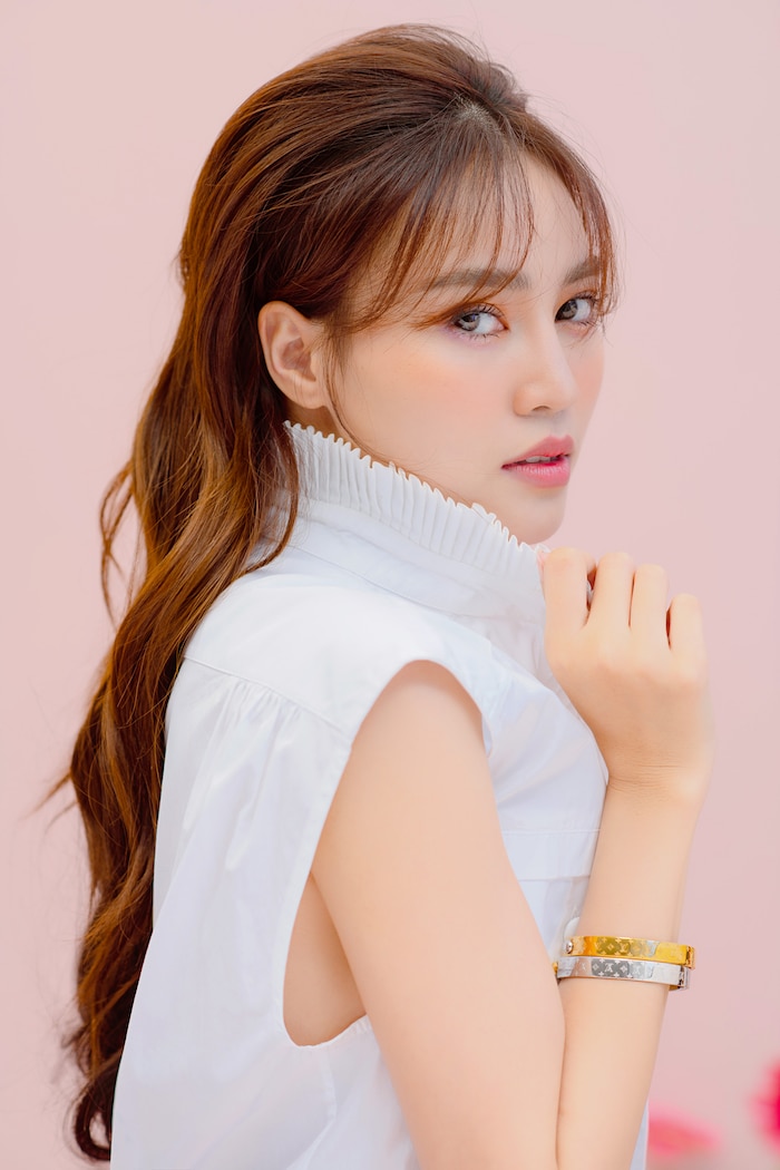 Trong bộ ảnh vừa tung ra, nhan sắc ngọt ngào của Lan Ngọc càng thăng hạng với lối trang điểm những tone màu ấm. Gò má và mắt được tạo hiệu ứng ửng sắc cam rất tự nhiên. Đặc biệt, phần bầu mắt và môi được điểm thêm gam hồng trong trẻo và ăn ý không kém.