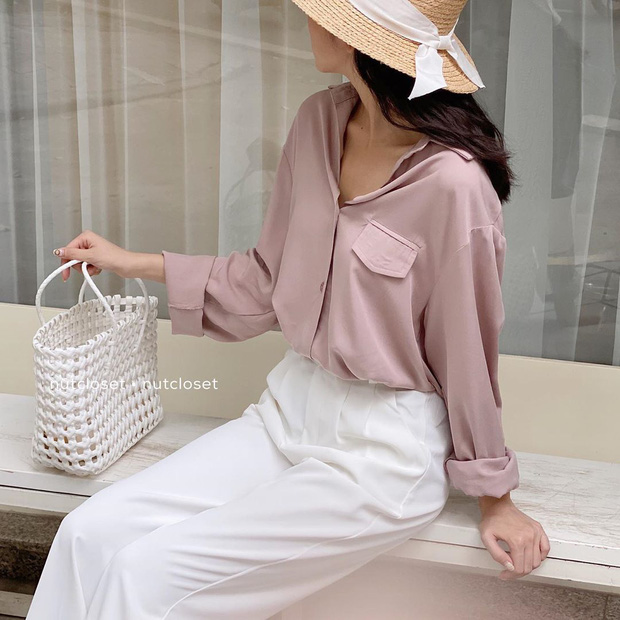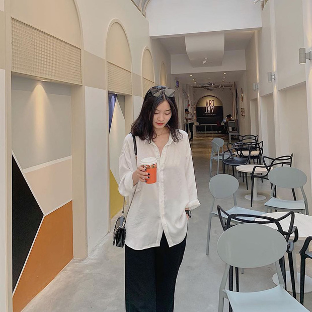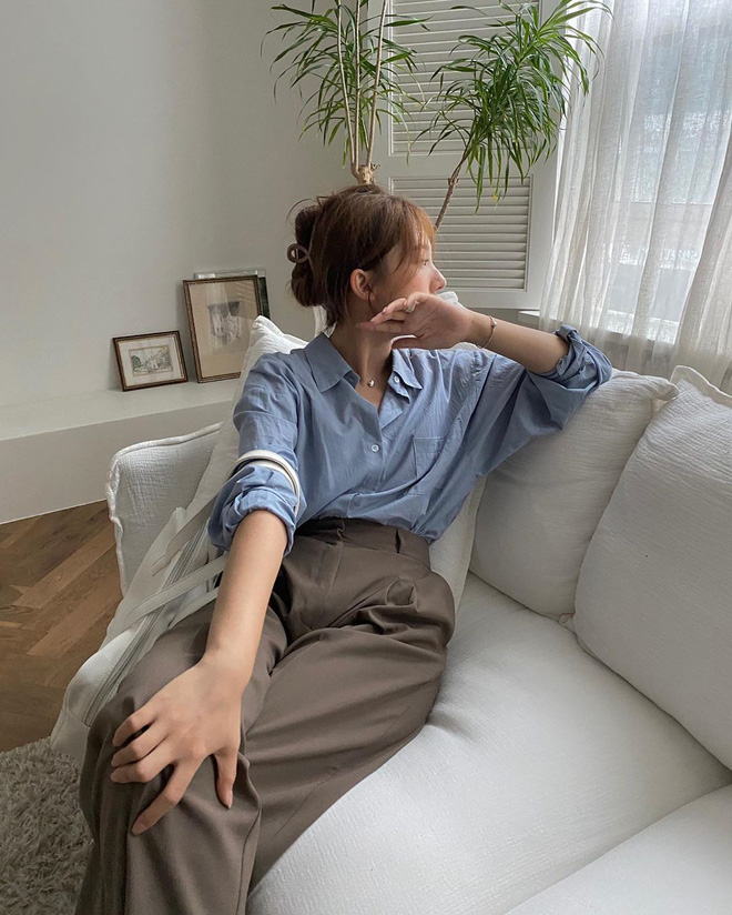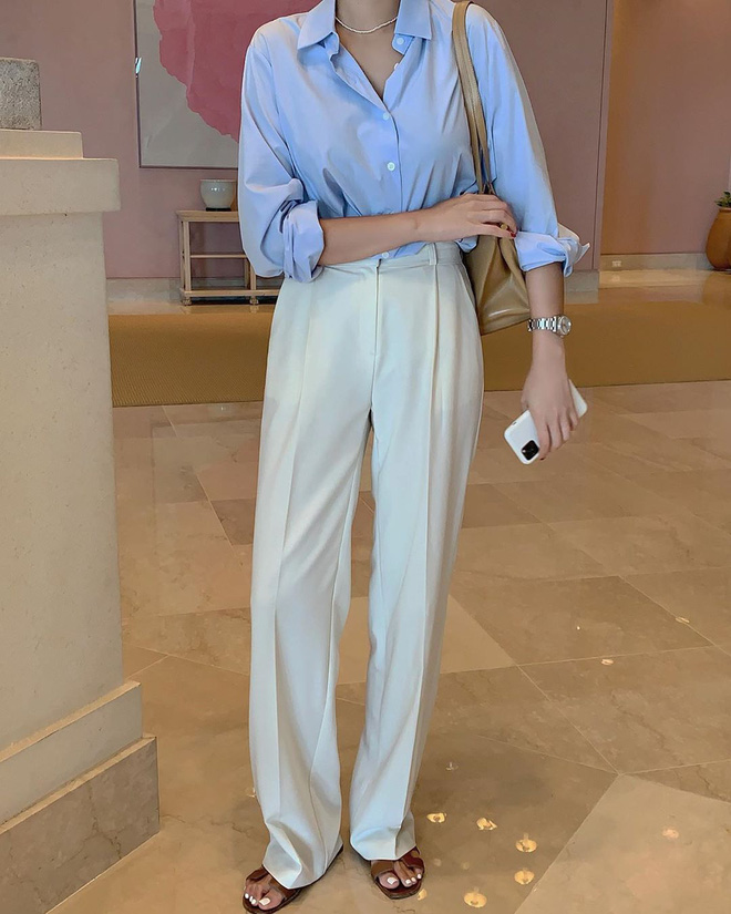 Một công thức mặc đẹp khác khi diện sơ mi hội chị em nên thử qua chính là "chơi chiêu" phối sơ mi và quần âu ống suông cạp cao nhé! Style lên đồ này chẳng những khiến vẻ ngoài phóng khoáng, trang nhã hơn mà còn "bonus" bạn thêm một đặc ân chính là hack dáng siêu đỉnh. Đó cũng là lý do các cô gái Hàn thường "quẩy" combo này lắm vì diện lên trông ăn gian chiều cao đến tợn.