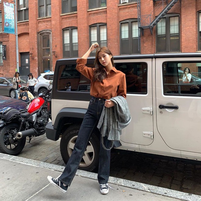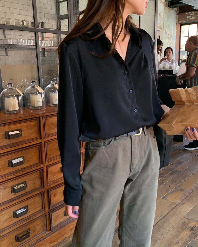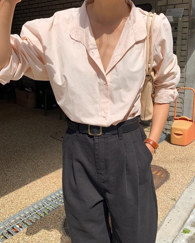 Đừng chọn sơ mi ôm dáng mà hãy chọn những kiểu áo oversized để toát lên vẻ phóng khoáng, hiện đại. Ngoài ra, bạn nên học các hot girl Hàn sơ vin chỉn chu và bổ sung thắt lưng nhằm tăng thêm điểm nhấn cho set đồ. Tất nhiên, "combo" sơ mi và quần ống suông sẽ còn chuẩn chỉnh hơn nếu bạn phối cùng sneaker, giày mũi vuông hoặc ankle boots.