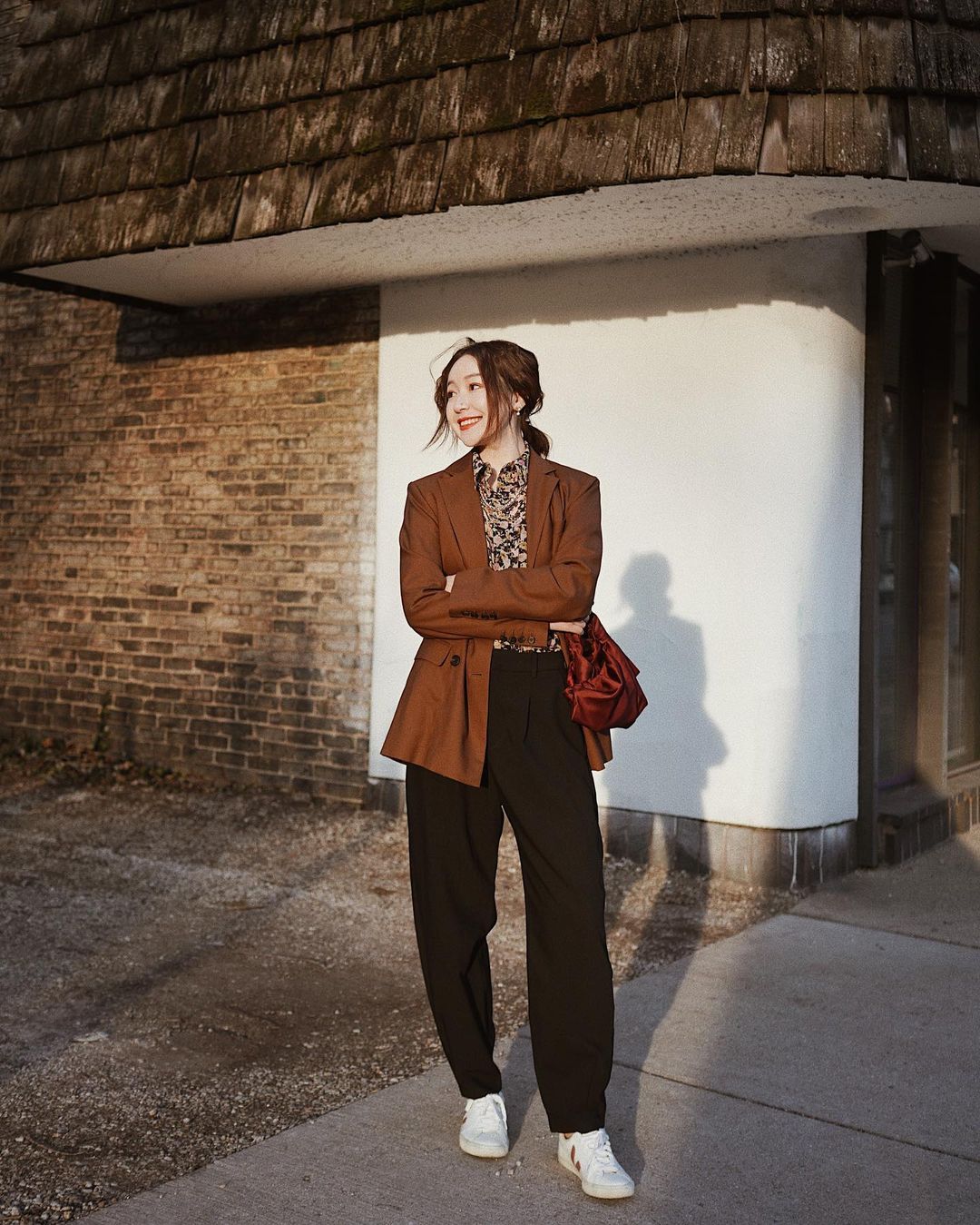 Blazer + quần ống rộng vốn chỉnh tề là vậy nhưng chỉ cần mix với sneaker trắng, set đồ của bạn sẽ ngay lập tức ghi điểm ở sự trẻ trung, phóng khoáng. Bạn cũng yên tâm rằng vẻ nhã nhặn của những đôi sneaker trắng sẽ ăn nhập tuyệt đối với vẻ thanh lịch của blazer + quần ống rộng, và tổng thể trang phục sẽ chỉ xịn đẹp trở lên chứ không bao giờ bị lệch pha, lạc quẻ.