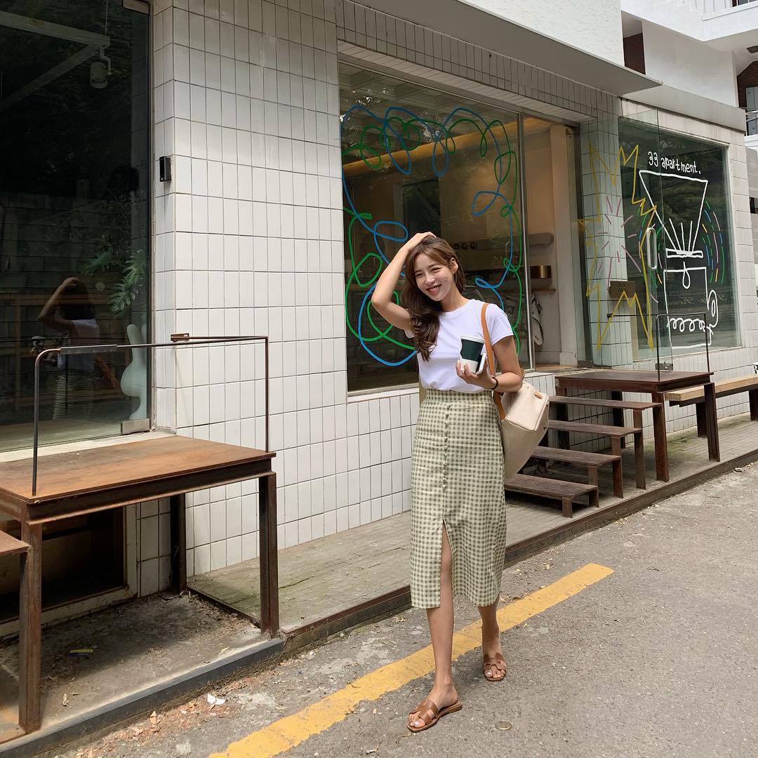 Ngay cả khi diện chân váy dài thướt tha, nữ tính, bạn vẫn sẽ có được bộ cánh trẻ trung và năng động nếu mix với áo phông. Còn trong trường hợp, bạn muốn tăng thêm hiệu quả "hack" tuổi cho vẻ ngoài, hãy kết hợp áo phông với chân váy ngắn rồi nhấn nhá đôi sandals hoặc giày sneakers.