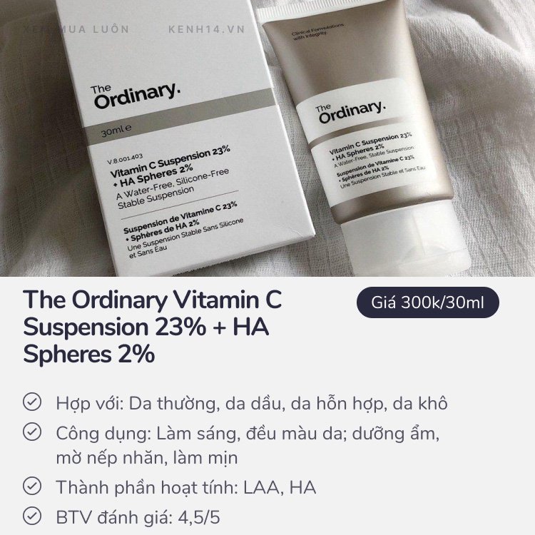 Cụ thể, sản phẩm mà cô Jenna đã sử dụng đó là The Ordinary Vitamin C Suspension 23% + HA Spheres 2%. Đây là dòng serum vitamin C có thành phần chứa bột LAA và HA giúp làm sáng và dưỡng ẩm.