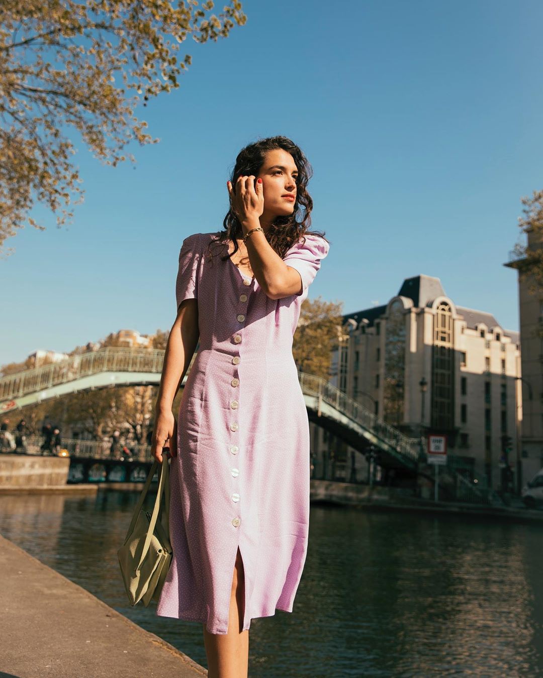 Không gây sốt điên đảo như đã từng vào mùa hè năm ngoái, nhưng đối với các quý cô người Pháp, váy cài khuy vẫn là item đáng để "trọng dụng". Và kết hợp với thiết kế cổ chữ V, một chi tiết nho nhỏ như hàng khuy chạy dọc thân váy cũng có thể làm nên chuyện, đem đến set trang phục bắt mắt, có điểm nhấn hơn cho người mặc.