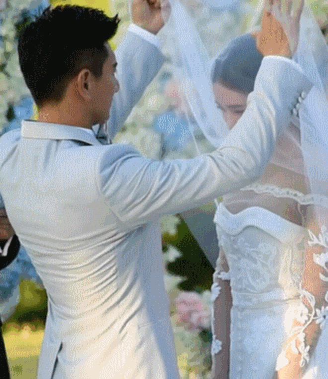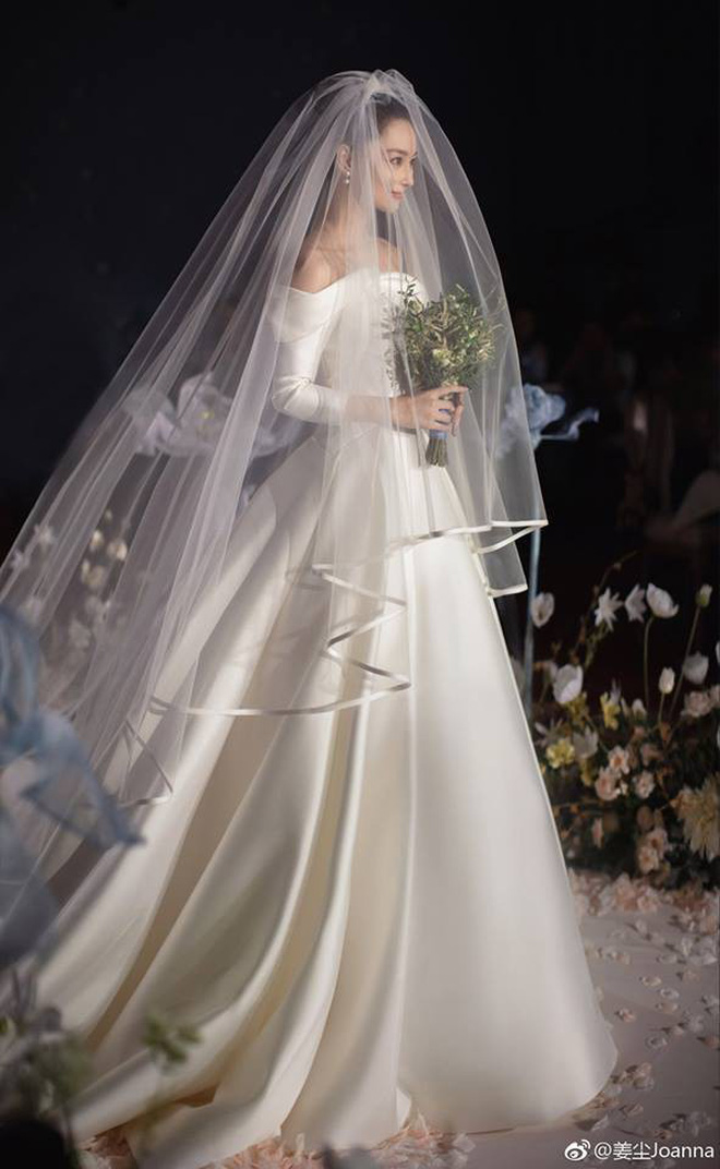 Lưu Thi Thi chọn cho mình một chiếc váy cưới nhẹ nhàng và nữ tính đúng như hình tượng ngọc nữ của cô. Bộ váy ren tinh xảo đến từ thương hiệu cao cấp của Pháp Carven có giá hơn 10 tỷ VNĐ, thiết kế cúp ngực đã được phối thêm lớp vải voan diềm đăng ten, thêu hoa nổi dọc cánh tay để tạo nét quyến rũ vừa phải. Qua lớp khăn trùm đầu, vẻ đẹp băng thanh ngọc khiết của Lưu Thi Thi đượm thêm vẻ e ấp của nàng dâu mới, đồng thời cũng không giấu được những giọt nước mắt hạnh phúc. Nhìn thấy cô nàng khóc ai nấy đều phải cảm thán đúng là người đẹp khóc cũng đẹp mà.