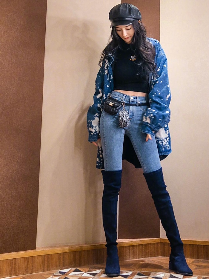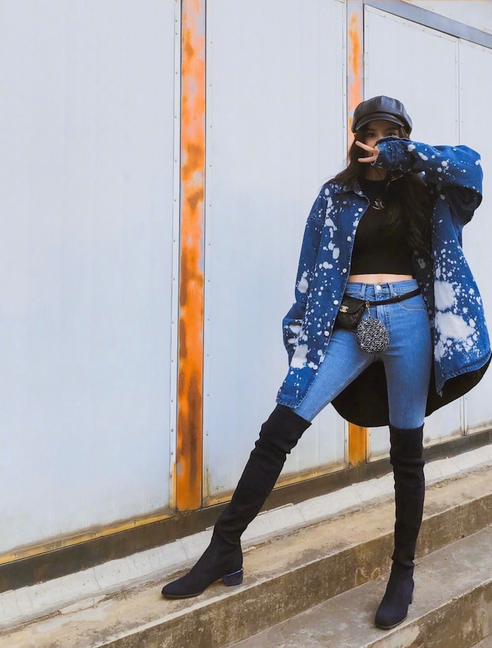 Cô nàng kéo léo sử dụng tone màu trầm là màu chủ đạo trong concept lần này khi phối áo croptop đen ôm sát cơ thể để lộ những đường cong quyến rũ với quần jean xanh đậm bó sát, áo khoác hoạ tiết độc đáo cùng belt bag Chanel chuẩn xu hướng.