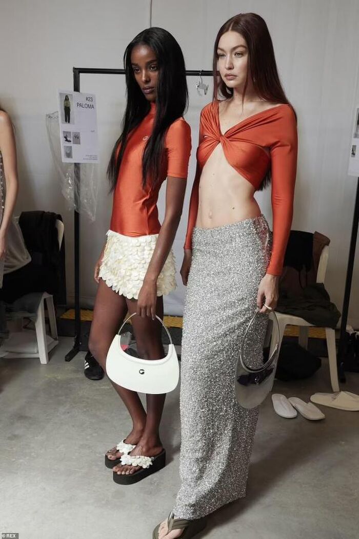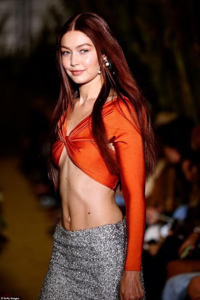 Gigi Hadid khoe cơ bụng săn chắc đáng kinh ngạc của mình trong chiếc áo crop top màu cam cực chất, chân váy sequin cùng đôi xăng đan đế bệt, đeo bông tai và mang túi xách màu bạc lấp lánh trong buổi trình diễn thời trang của Coperni Spring 2022. Người đẹp thể hiện thần thái sang chảnh, quyến rũ cùng những bước chân lạnh lùng, chắc nhịp. Đây là buổi trình diễn đầu tiên của cô ở thủ đô nước Pháp.