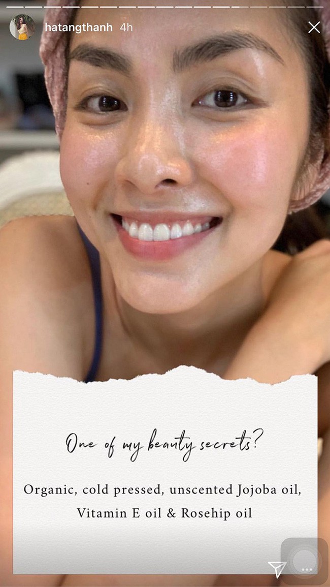 Hà Tăng từng chia sẻ bí kíp giữ tạo nên làn da đẹp của cô chính là ở nhờ dầu jojoba, vitamin E và dầu nụ tầm xuân. Từng không tin vào hiệu quả của những sản phẩm này nhưng sau khi dùng thử cô đã thực sự thấy bất ngờ.