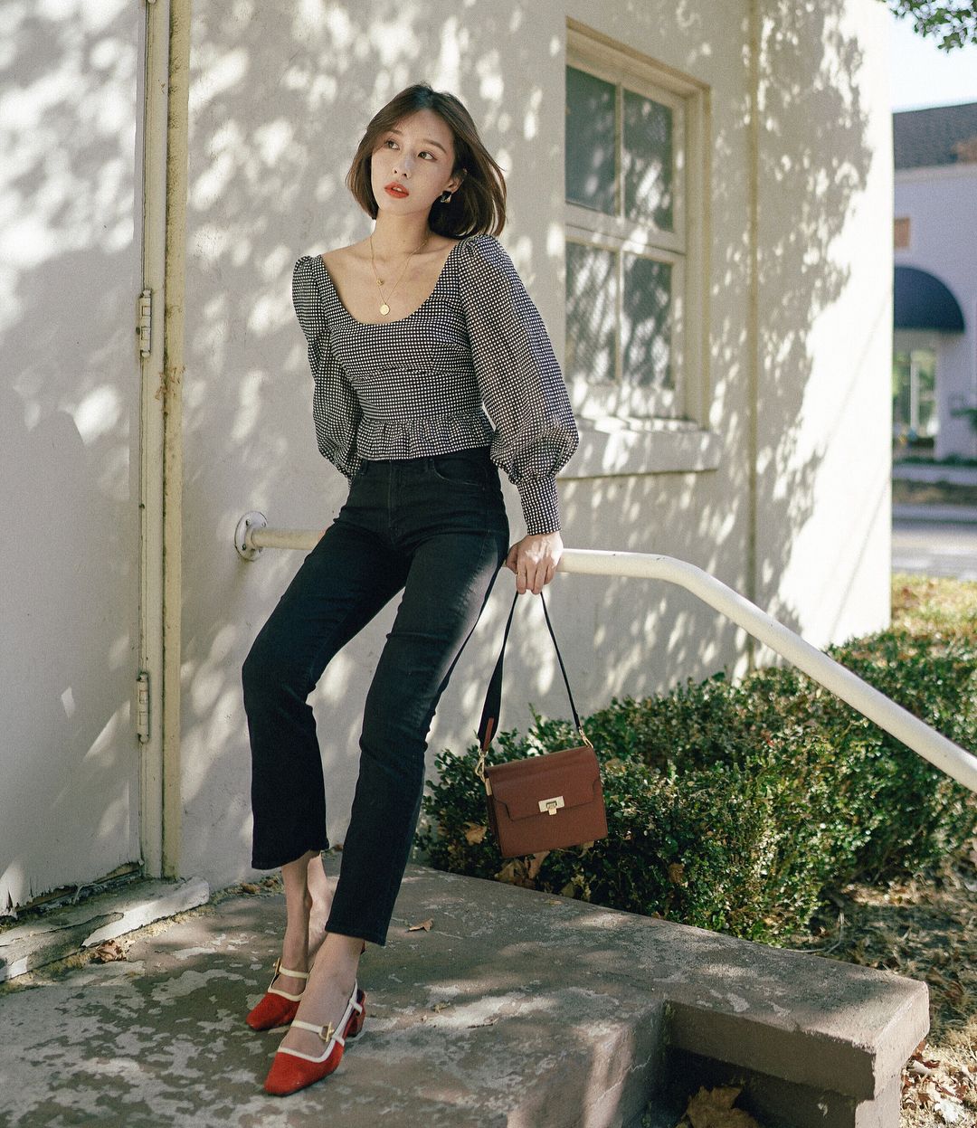 Combo Tiểu thư: Sơ mi vải tweed + Quần đen + Giày búp bê/ Guốc cao gót