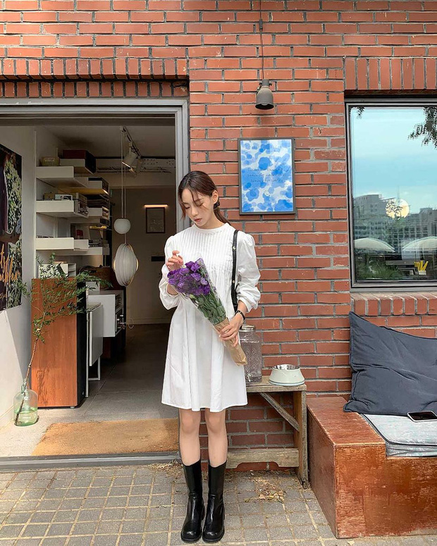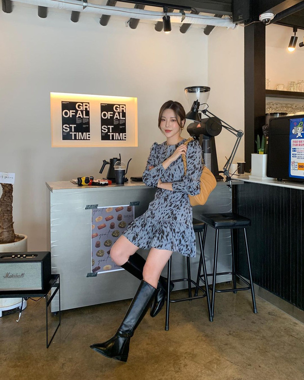 Cô nàng này lại mang đến 1 outfit đậm tính mùa thu, diện đi cà phê, đi chơi cuối tuần là chuẩn lắm luôn này. Nét dịu dàng, nữ tính của váy liền dài tay khi kết hợp với boots đen cao cổ mang đến 1 vẻ ngoài đầy trendy, hút mắt.