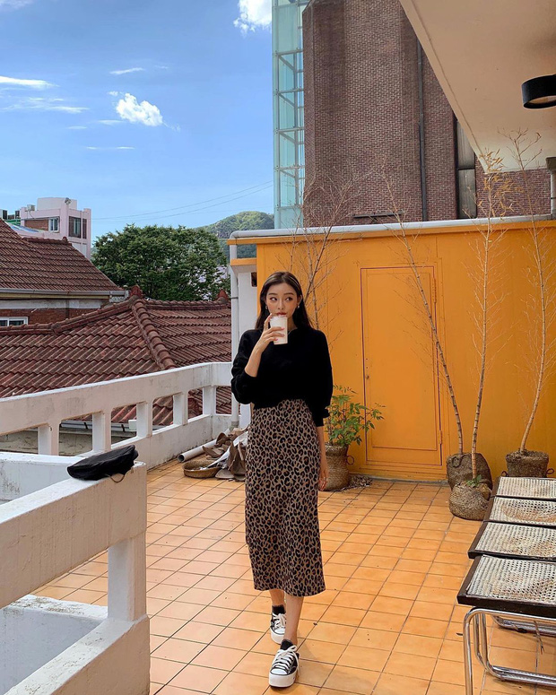 Chân váy dài họa tiết da báo thu này vẫn giữ nguyên được sức hút với gái Hàn. Không cần cầu kì mix&match, chỉ riêng nét chấm phá độc đáo trên váy đã đủ để mang đến 1 vẻ ngoài phá cách, thời thượng. Điển hình như cô bạn này, phối cùng 1 chiếc áo đen trơn mà outfit trông vẫn ra gì lắm đó chứ.