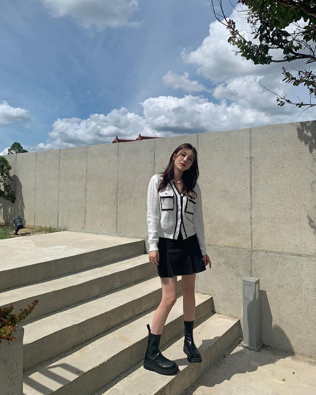 Nếu muốn trông tiểu thư, điệu đà, mời bạn thử ngay set đồ giống cô bạn trong hình dưới đây. Áo cardigan dáng lửng kết hợp cùng chân váy ngắn, nhấn nhá thêm 1 đôi boots mũi tròn, outfit này mặc đi học, đi chơi hay đi hẹn hò thu này là chuẩn khỏi bàn luôn.