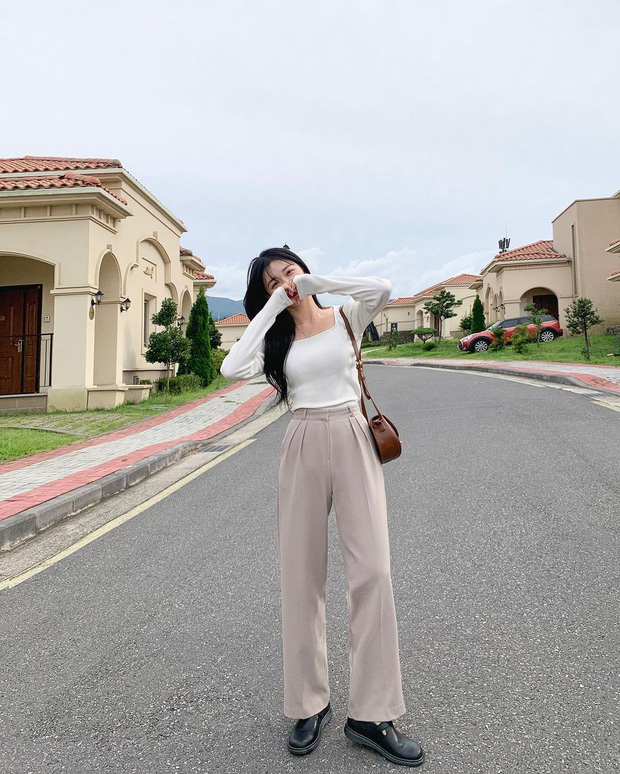 1 trong những item mặc đẹp suốt 4 mùa trong năm, ấy chính là quần ống suông. Item này qua tay gái Hàn được mix&match khéo ghê, phối cùng áo thun ôm sát cổ vuông phía trên, vừa tôn dáng mà lại hiện đại thế chứ.