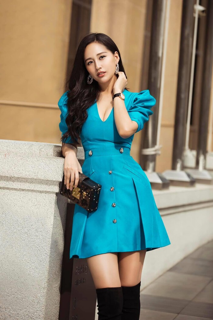 Trong bộ ảnh streetstyle mới nhất, nàng hậu Việt Nam khoác trên mình bộ váy xanh mix cùng boots đen cổ cao và clutch cầm tay hiệu Louis Vuitton. Thiết kế váy khoét ngực tôn lên vòng 1 của Mai Phương Thúy và những điểm vàng cơ thể.