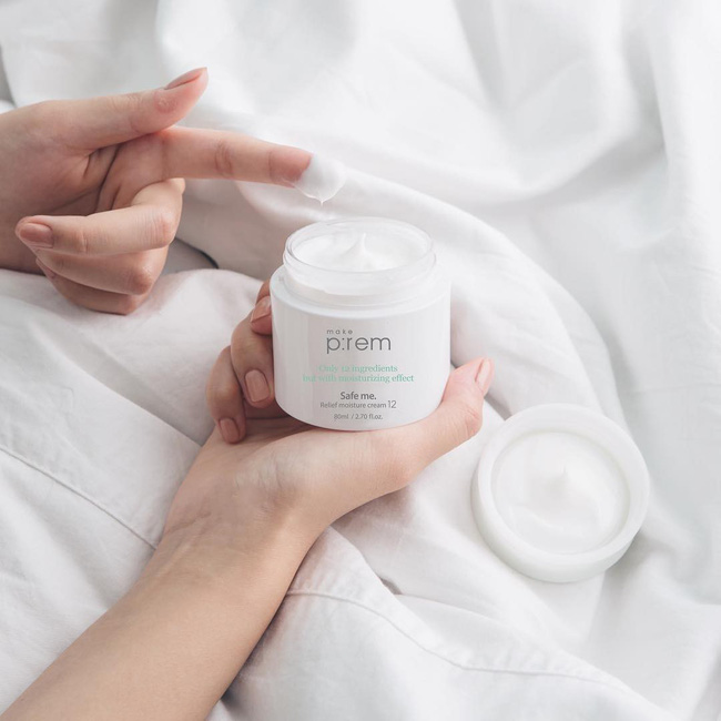 Sản phẩm gợi ý đến bạn là Make P:rem Safe Me Relief Moisture Cream 12, lọ kem lý tưởng cho làn da nhạy cảm nhờ công thức chứa 93% chiết xuất thực vật, độ pH là 5.5. Thành phần saqualane và glycerin sẽ đảm nhận vai trò cấp ẩm cho da; trong khi đó, chiết xuất quả mâm xôi sẽ nuôi dưỡng và bảo vệ lớp màng ẩm tự nhiên của làn da khỏi sự tấn công của các gốc tự do.