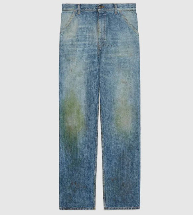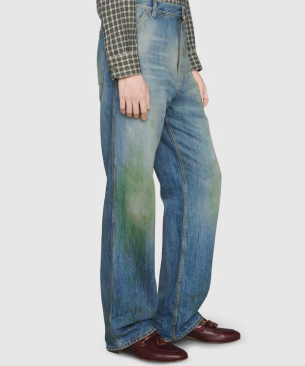 Mới đây, thương hiệu thời trang xa xỉ của Ý - Gucci đã tung ra mẫu quần jeans mới trị giá gần 800 USD (18 triệu đồng) với những "vết ố" loang lổ màu xanh rêu ở đầu gối. Với những người yêu thích chất liệu denim, nhà mốt Ý còn sản xuất riêng mẫu quần yếm công nhân với giá 1092 USD (25,317,474 VNĐ) một chiếc.