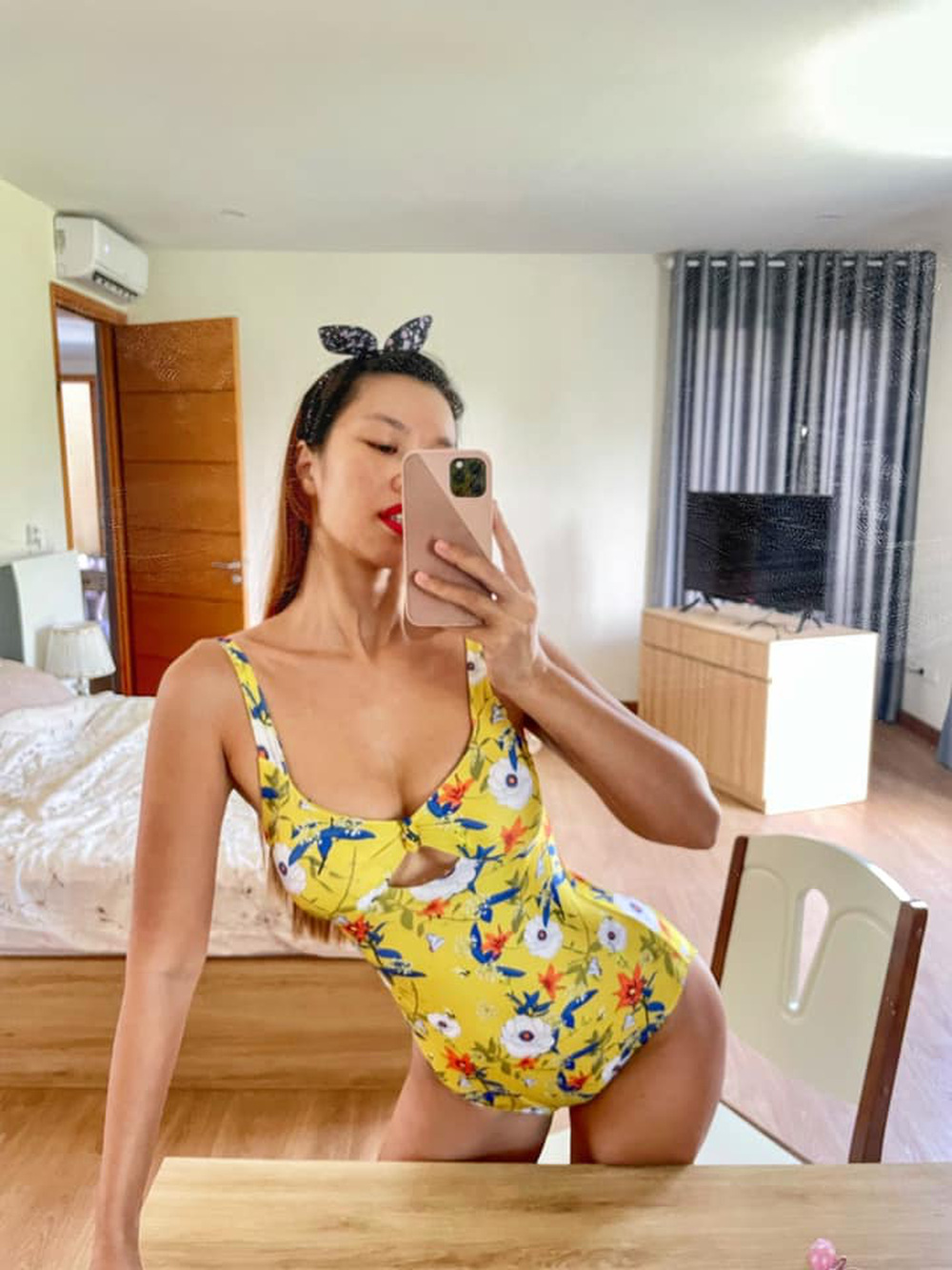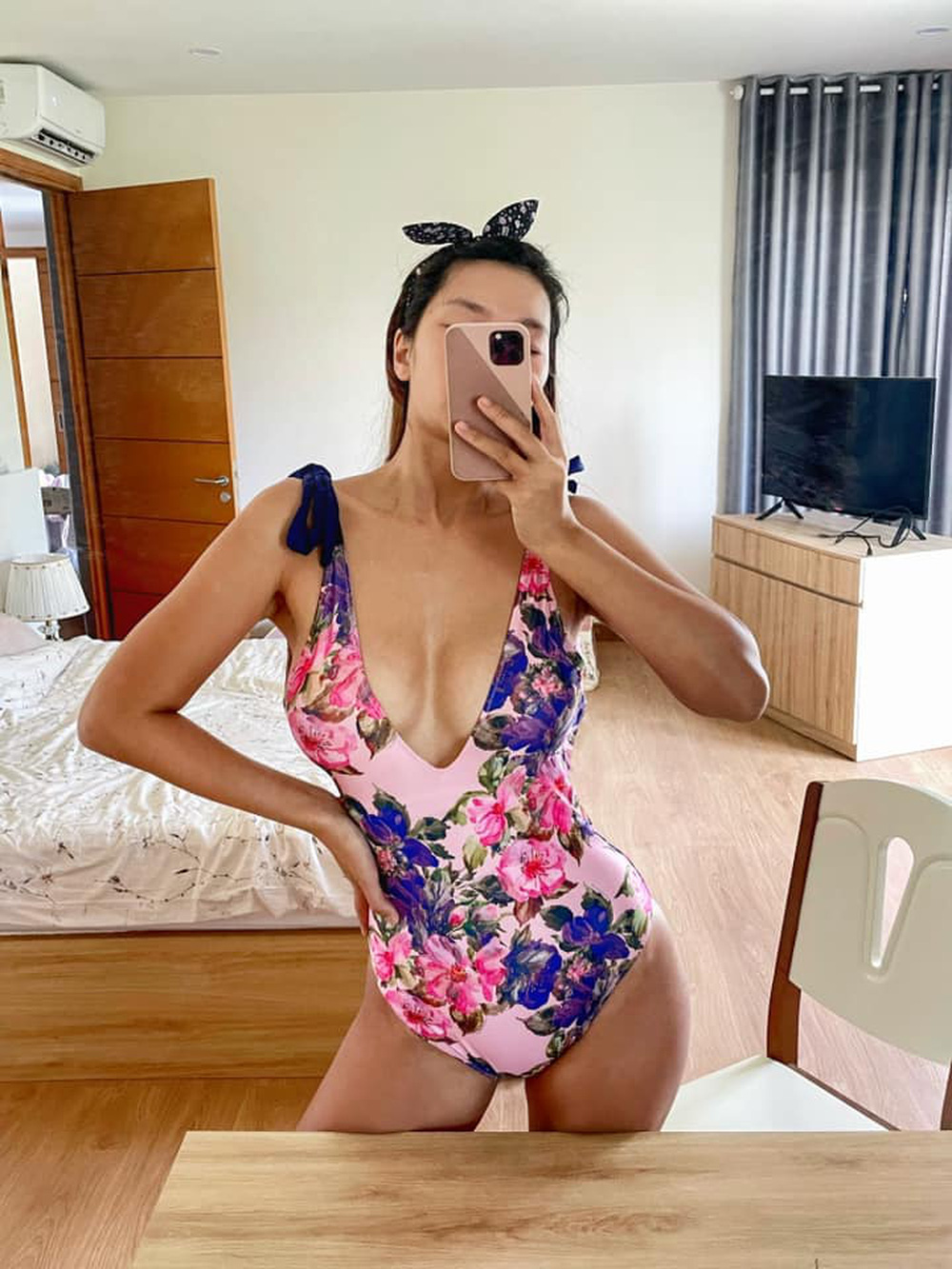 Siêu mẫu Hà Anh hài lòng với vóc dáng hiện tại sau 3 năm sinh nở, cô không chỉ diện bikini khi đi bơi mà ngay cả lúc nấu ăn.