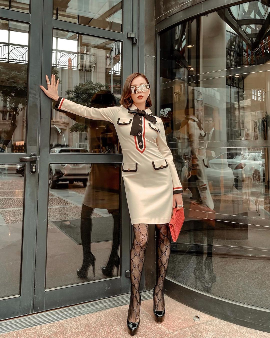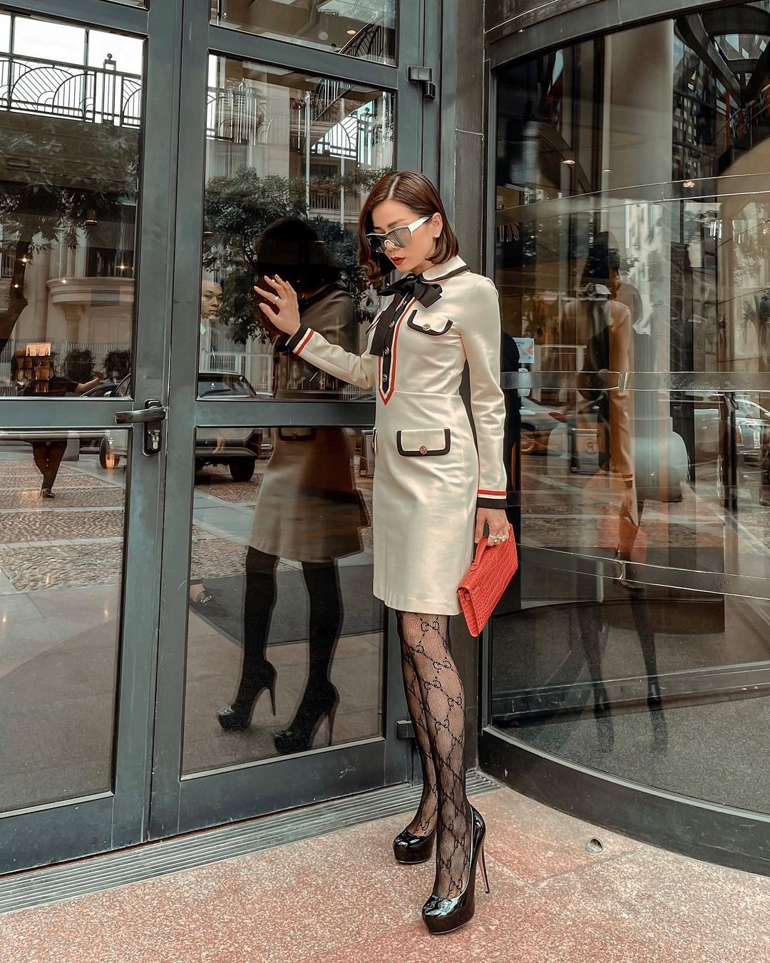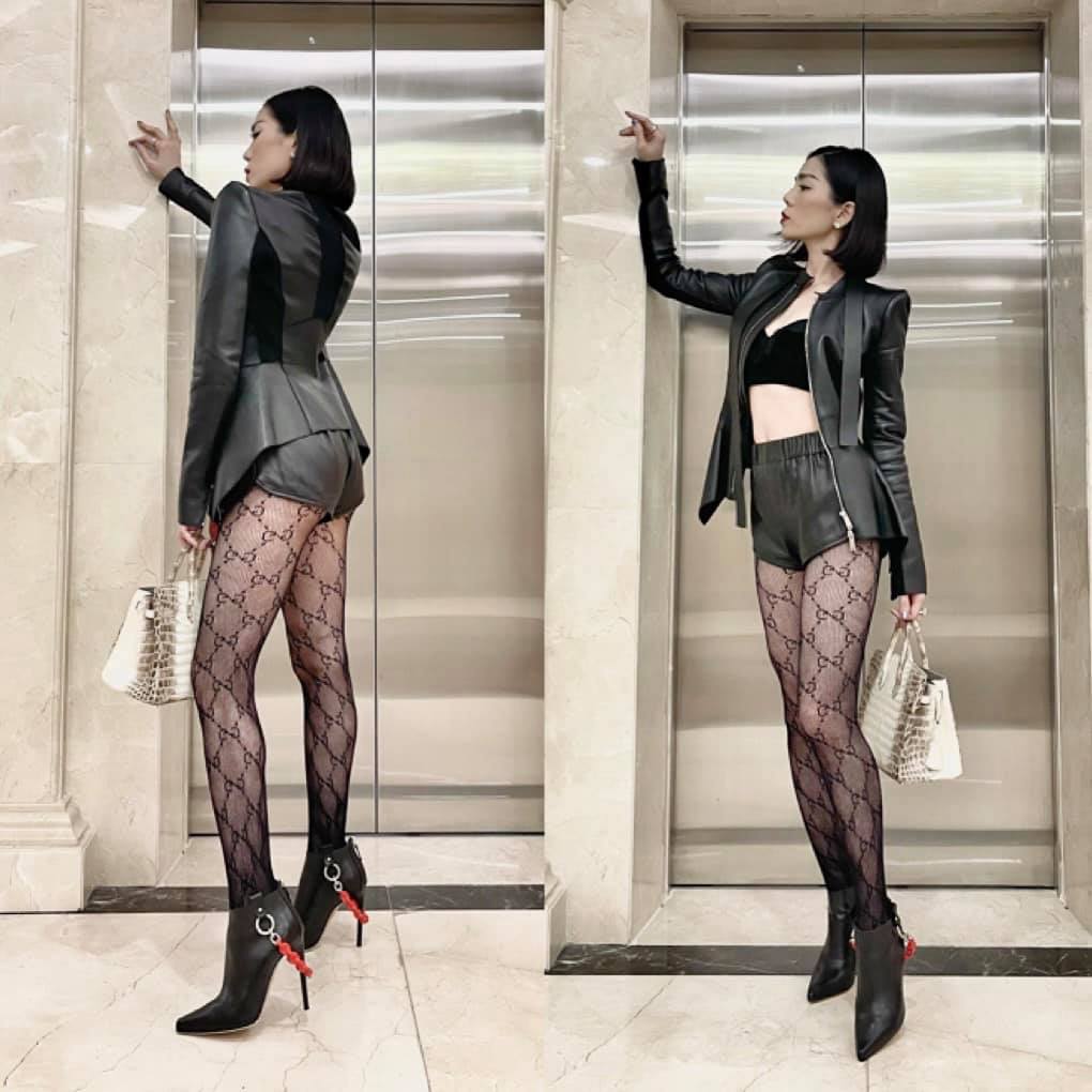 Nhắc đến hàng hiệu thì Lệ Quyên chính là một trong những "nữ hoàng của Vbiz", cô dát hàng hiệu mọi lúc mọi nơi và cũng có những cách mix&match đặc biệt. Lần xuất hiện mới nhất Lệ Quyên diện một bộ đầm Gucci thanh lịch sang trọng nhưng lại kết hợp cùng đôi tất lưới Gucci sexy táo bạo - cách kết hợp mà trước giờ chưa có một tín đồ hàng hiệu nào từng thử nghiệm.