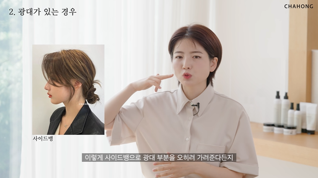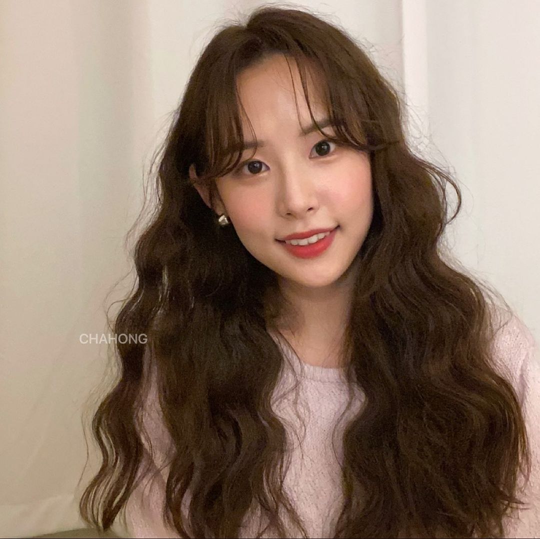 Lời khuyên của hair stylist Cha Hong là các nàng hãy để tóc "mái bay". Khi cắt kiểu mái này, thợ làm tóc sẽ lấy hai bên tóc sát viền trán, sau đó tỉa đuổi về phía xương hàm, tạo thành hình chữ S rất mềm mại, bay bổng. Tóc mái bay sẽ tạo sự hài hòa cho gương mặt có gò má cao, hoặc má trước phúng phính, từ đó visual thêm thăng hạng.