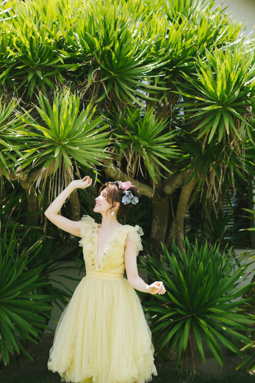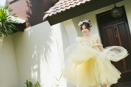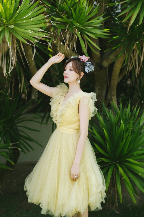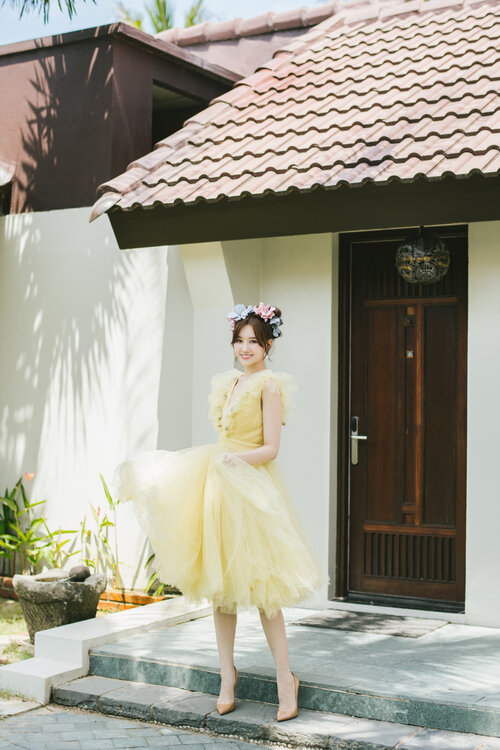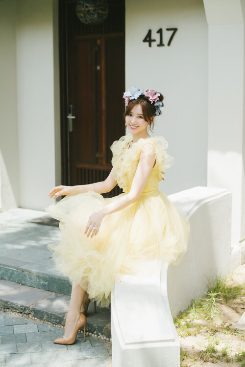 Trong chuyến đi, nữ ca sĩ cùng mẹ cũng tranh thủ thực hiện bộ ảnh thời trang với những bộ trang phục ấn tượng. Chất liệu chủ đạo của trang phục mà Hari Won lựa chọn lần này là voan mềm, với tone màu pastel nhẹ nhàng. Bên cạnh đó, thiết kế đầm xếp li nhiều tầng bồng bềnh kết hợp phụ kiện hoa đính tạo nên điểm nhấn tổng thể.