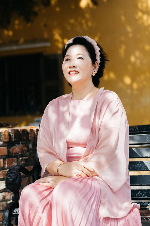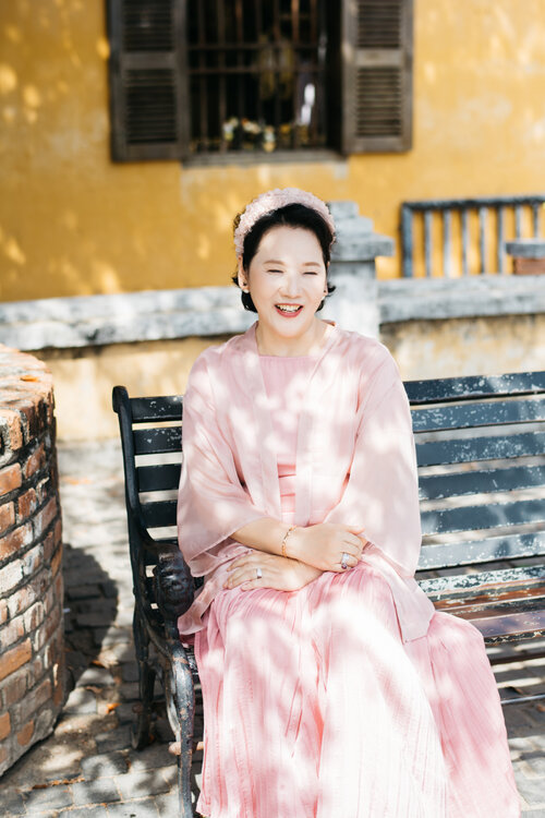 Mẹ Hari Won cũng lựa chọn voan mềm làm chất liệu chính trong trang phục của bộ ảnh, giữ những chi tiết đặc trưng của Hanbok như đường nẹp viền áo, cùng với tone màu tím nhạt tạo cái nhìn quý phái.