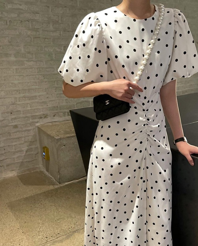 Một đại diện "xinh quên đời" không thể thiếu khi nhắc đến váy vóc chính là váy chấm bi. Dù đây là một chiếc hoạ tiết có tuổi đời "đi cùng năm tháng" nhưng chưa bao giờ làm các quý cô thất vọng. Nếu biết lựa chọn, váy chấm bi sẽ giúp vẻ ngoài của bạn trở nên thanh lịch, sang trọng, đứng đắn mà không "dừ". Đặc biệt, chấm bi trên váy còn có đủ kích cỡ, tha hồ cho chị em "quẹo lựa" mẫu phù hợp với vóc dáng. Nếu còn e dè trước những loại chấm bi to bản, bạn có thể chọn những mẫu chấm bi nhỏ xinh nịnh mắt.