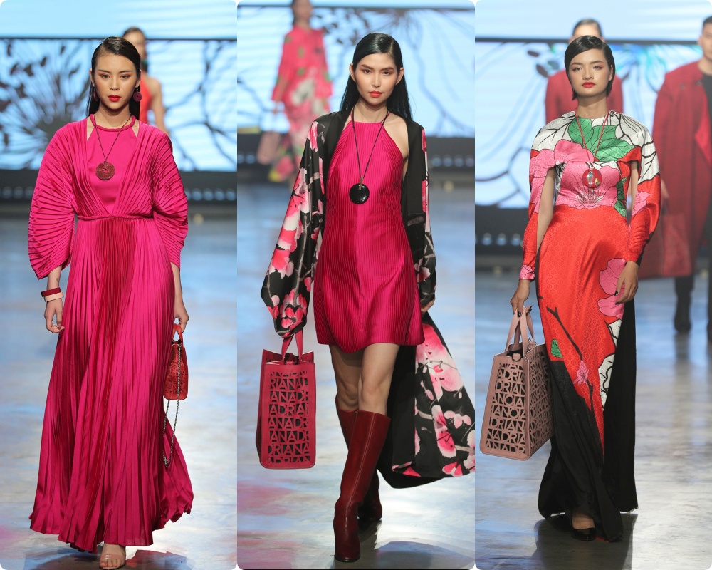 Đương đại và nhanh nhạy với xu hướng là thế, nhưng Adrian vẫn tiếp tục khéo léo lồng ghép những lát cắt xưa cũ vào trang phục và phụ kiện. Đâu đó trong những phom áo váy, người xem vẫn có thể nhận ra kết cấu cổ trụ hay những đường xẻ sâu dọc thân như áo dài truyền thống. Trong những thiết kế khác, họa tiết houndstooth xen kẽ cùng kỹ thuật draping tạo phom dáng cứng cáp và đường cắt chuẩn xác, khéo léo tôn lên đường cong của người mặc.