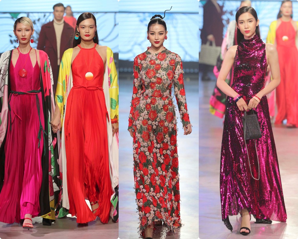 Từ áo dài, áo yếm cho áo tứ thân cách điệu, những điều tưởng chừng như thân quen nay xuất hiện theo cách đầy lạ lẫm dưới góc nhìn của anh. Xuyên suốt các mẫu thiết kế này là các gam màu nóng như đỏ, hồng và cam làm chủ đạo, một lần nữa càng trở nên mong manh trên chất liệu lụa là, gấm và voan được đính kết hay xử lý cầu kỳ.