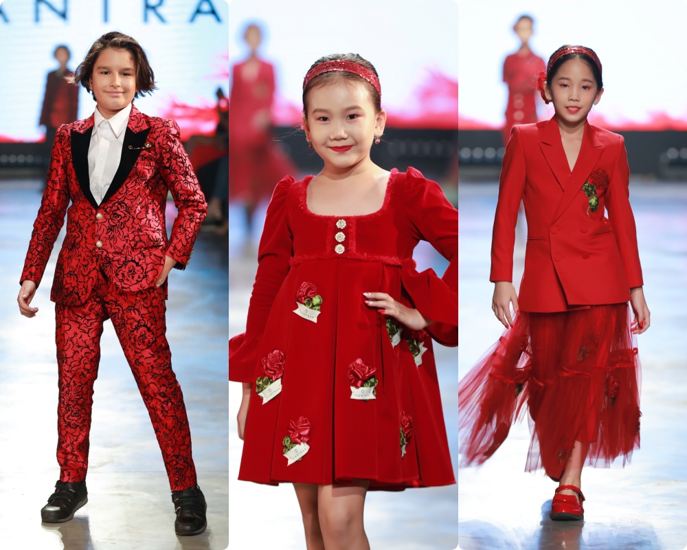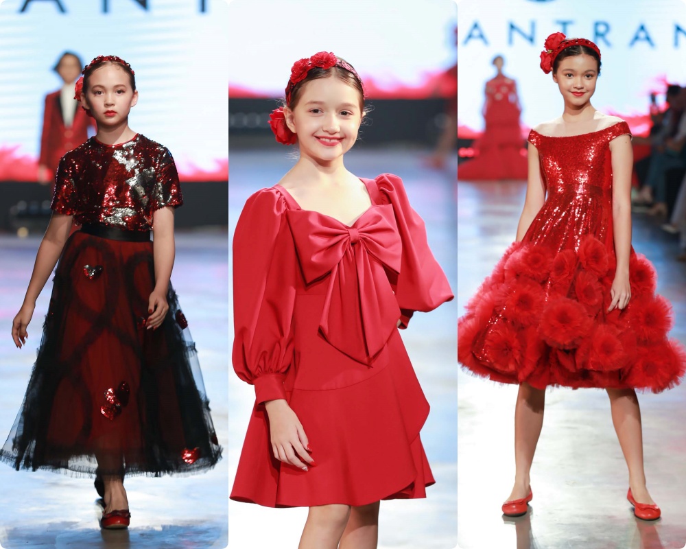 Điểm nhấn của bộ sưu tập là chất liệu nhung, những hoạt tiết đính nổi trên chân váy và sequin được in lên chất liệu một cách độc đáo. NTK Tuấn Trần đã rất khéo léo xử lý từng đường may để mang đến sự thoải mái nhất cho các bé dù đó là những thiết kế từ chất liệu khá nhạy cảm với da như vải tulle, sequin hay ren.