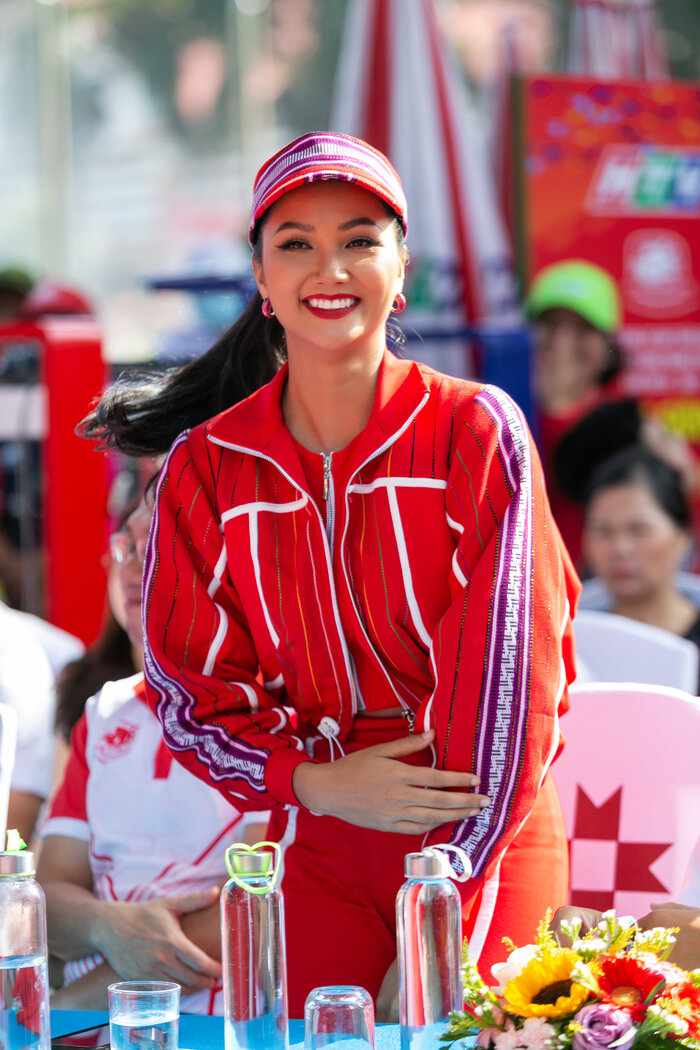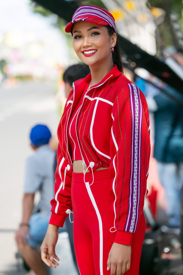 Sáng 30/05, có mặt tại chặng Buôn Ma Thuột của cuộc đua xe đạp tranh cúp truyền hình TPHCM - Non sông liền một dải, Hoa hậu Hoàn vũ Việt Nam 2017 - H’Hen Niê tạo ấn tượng với khán giả khi xuất hiện trong trang phục sporty “đỏ toàn tập” từ chất liệu vải thổ cẩm Ê Đê.
