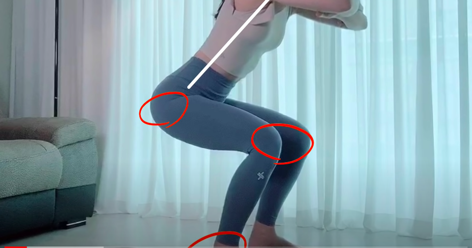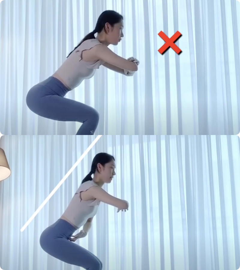 Tư thế đúng phải là hai chân vuông góc với sàn, hạ thấp đến khi đùi vuông góc với cẳng chân rồi mới đứng lên. Và bạn cũng nên chú ý không để đầu gối quá mũi chân như vậy mới tránh được việc đầu gối bị trấn thương trong quá trình tập.