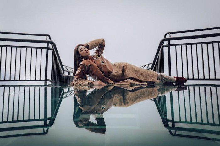 Khánh Vân thích thú với cầu kính lơ lửng giữa không trung nên thực hiện bộ ảnh ghi dấu kỷ niệm.
