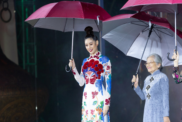 Tại chương trình, cùng với các Đại sứ khác, Hoa hậu Khánh Vân xuất hiện rạng rỡ trên sân khấu với chiếc ô trên tay.