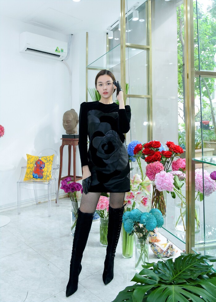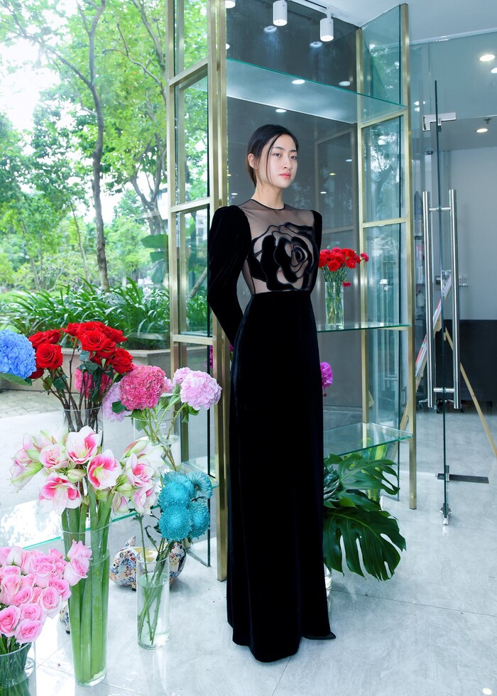 Khoác lên mình bộ váy nhung dài với phần thân xuyên thấu, phần ngực được che chắn bằng họa tiết bông hồng cách điệu tinh tế, Lương Thùy Linh trông vô cùng gợi cảm. Đây là lần đầu cô diện trang phục táo bạo, khoe vòng 1 lấp ló căng đầy.
